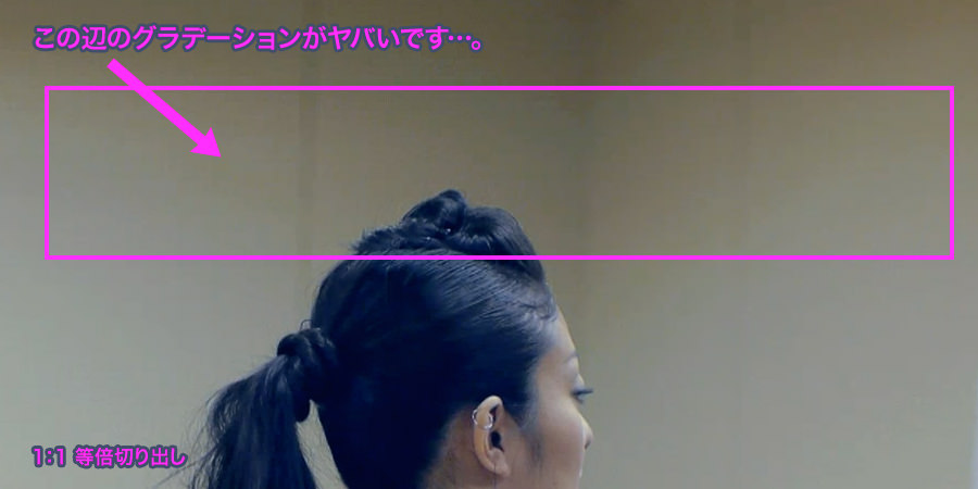 バンディング。これはやっぱり 4:2:2の色深度と、H.264よりもましな圧縮方式が出てこないと厳しいのかなぁ?(サンプル画像参照)