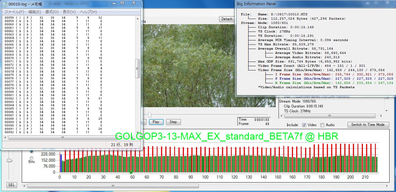 ほかのテスターのものも含め、1080iのGOPテーブルの主流は「1.4.4.1.25.25」的な並びなんですけど、これだとどうしても動きの中でかなりビットレートが下がってしまいます。 これを、動いても止まってもどちらでも高ビットレートを維持するようにできないものか・・・というのが、ずーっと気になっていることなんです。 MAX_EX_BETA7fでもそこそこいけてるかもしれませんが、これはもう少し極端にしたものになっています。なので止まるかも・・・?