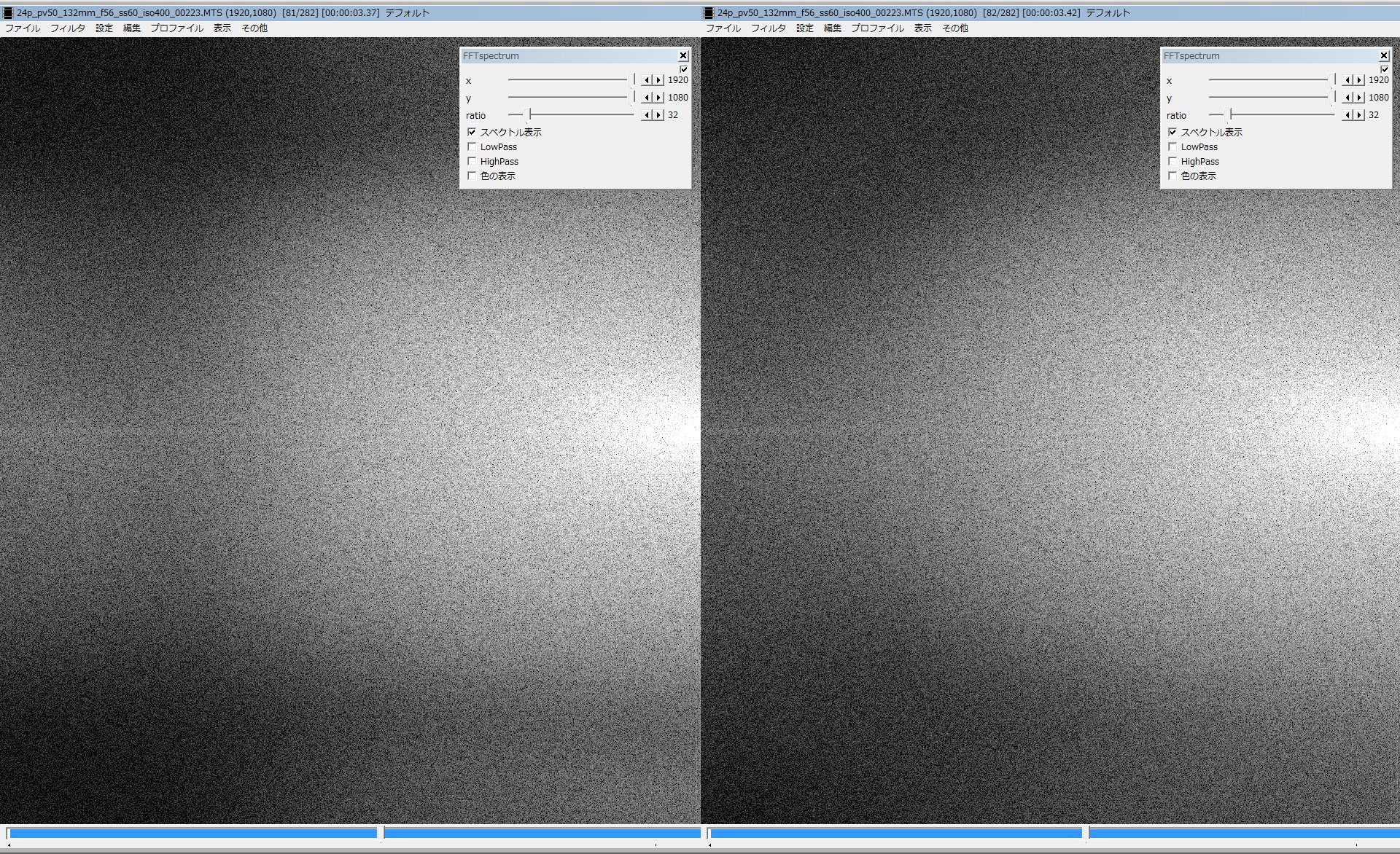 脈動の違いは「FFTスペクトル表示フィルタ」が判り易そうですが、Beta7fはコマ送りでようやく判るレベルなのが、、、Valkyrieは静止状態で比較しても I-frameが特殊なのが一目瞭然でし。(注;画像が大きくなり過ぎるので、FFTスペクトル表示は左側半分だけ並べてます) <Valkyrie SmC>左が I-frameで、右が B-frame
