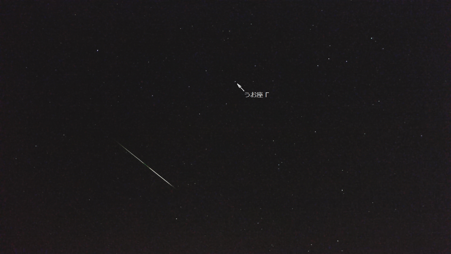 動画としては流星が少なすぎて御見せする気が起きませぬが、うお座を中心にペガスス座/クジラ座も合わせての2等星から6?等星くらいまではシッカリ写っておりまする。肝心の流星ですが、、、対地速度の速い流星ゆえか2フレームに写るのが精一杯で動画的には今一つでしょか??。