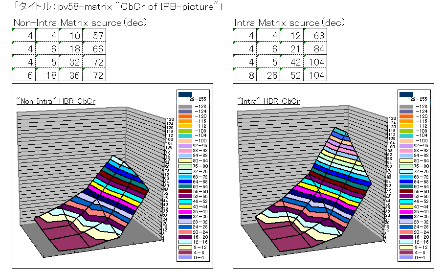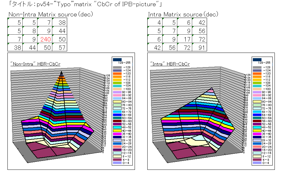 har-kさん 先ほどはお付き合いいただきましてありがとうございます<(_ _)> 720pのマトリックス選びですが、さっきの続きで、444マトリックスに、Nick作の444SoftのP,BのY(輝度)を採用してみた(Iフレームと、PBフレームのCb,Crは444マトリックスのまま)んですが、これなら点滅しませんでした!( ゚∀゚) Pフレーム Y (輝度) 4 4 4 8 4 6 8 16 4 8 32 108 8 16 108 255 Bフレーム Y (輝度) 4 4 6 16 4 12 20 20 6 20 32 56 16 20 56 255 果たしてこれに意味があるのかはわかりませんが・・・har-kさんとsyoushowさん、どう思います?