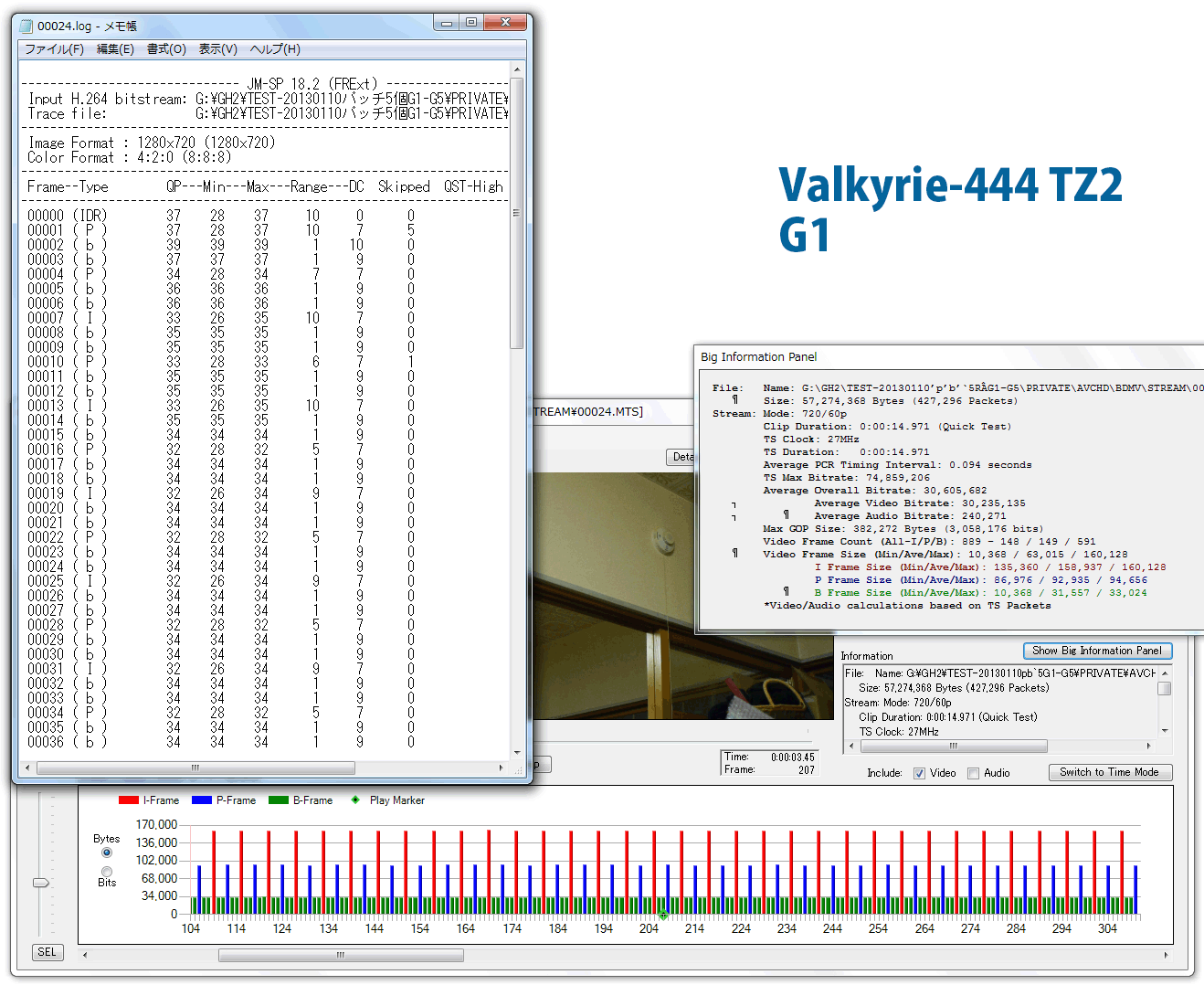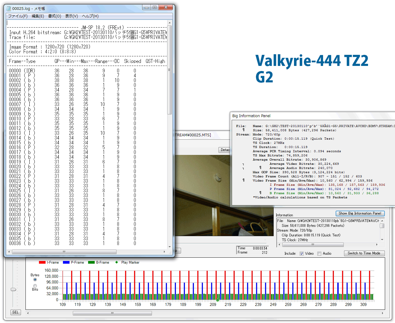 ojikoさん お手間を取らせて申し訳ありませんでした<(_ _)> ちなみに、今回はもういいですけど、logを見る場合、最初の数秒間は数値が安定しないので、できれば100フレームより後の部分を見たほうがより正確に分析できます。 JM-SPデコーダでは、確かデフォルトでは最初から100フレーム目までしか分析しない設定になってたと思いますが、これを例えば500フレームまで拡張することが出来ます。 StreamParserの左上の「Configuration」を押して「Configure JM-SP Decoder」を選ぶと最初から何フレームまで分析するか任意の数字を入れられる画面が出てきます。 あまり大きな数字にすると今度は分析にかかる時間が長くなるので、お好みの塩梅で数字は決めてください(・∀・) 詳しくはこちらに載ってます↓↓↓↓↓ http://www.raitank.jp/wiki/gh2-hack-wiki-bkmcwd-and-his-gangs/streamparser