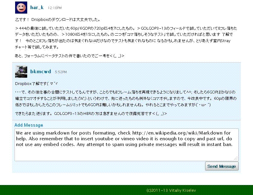 で、VKに元に戻してくれと頼んだのですが、戻すつもりはないんで、表で別のトピ立ててそこでやりとりしてくれと断られましたw 本家の「表」でやったらそれこそ日本語が使えなくてメンドクセーので、今後はDropbox等を活用することにします。 さきほどYouTubeは使えないか試しましたが、なぜかダメでした。YouTubeも変わった? vimeoはもしかしたらまだいけるかもしれませんが・・・ 個人的な環境の問題ですが、メーラー使わずにセッティング内容を送れるのが今までとても便利だったんですよねーせっかくログインしてるわけですし・・・