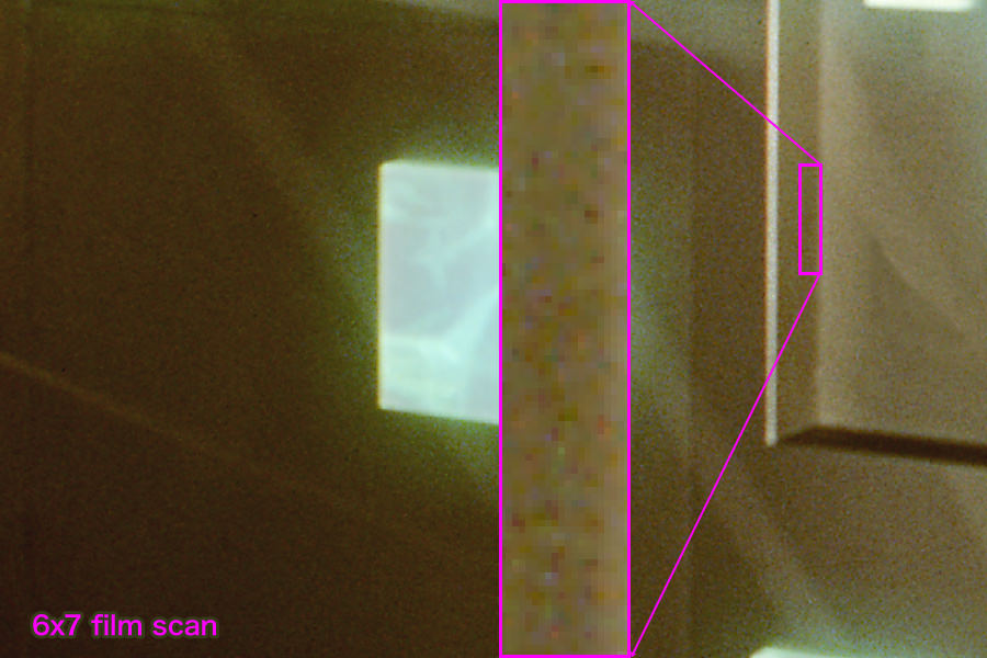 1枚目:ブローニーカメラで撮影したフィルムのスキャンデータからの1:1切り出し、及び部分拡大600%