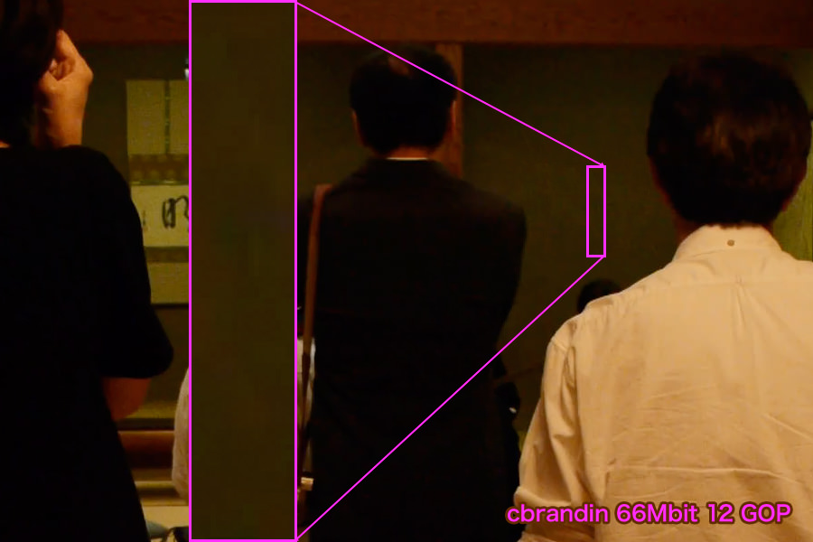 raitankさん ちょっと分かりませんがGOP1にすることでビットレートの平均値を高い水準に抑えることができるかもしれません。ビットレートのバリアブルが大きいのはもしかしたらP,Bフレームの作用によるのかもしれない、と思っています。科学的根拠は全くないのですが、GOP1の設定のほうが、ビットレートが少なくて済む被写界震度の浅い映像であっても、高いビットレートで描写を細部に至るまで丁寧に描きだしているからです。LONG GOPの参照フレームくんはビットレートをけちって、細部の描写をさぼりがちな気がするんですね。そのため、全体のビットレートを贅沢なまでに上げなければ参照フレームの描写力は上がらない、という気がします。ですが、この意見は私自身なんとなくそうかもしれないし、そうでないかも、というちょっと自信ゼロの考えです。汗 逆に言えばGOP1では屋外などビットレートがたくさん必要とされる場面では真っ先に暗部の諧調が犠牲にされるのかもしれません。 GH1のHACKでIpowellさんが作った100Mbps Max Latitude Patch は12から15というLONG GOPで、デフォルトの設定と比べ暗部の三分の一から二分の一EVのラチチュードが改善されているそうなので、やはりGOPより全体のビットレートの調整が肝なのかもしれません。 不躾ながら失礼しました。