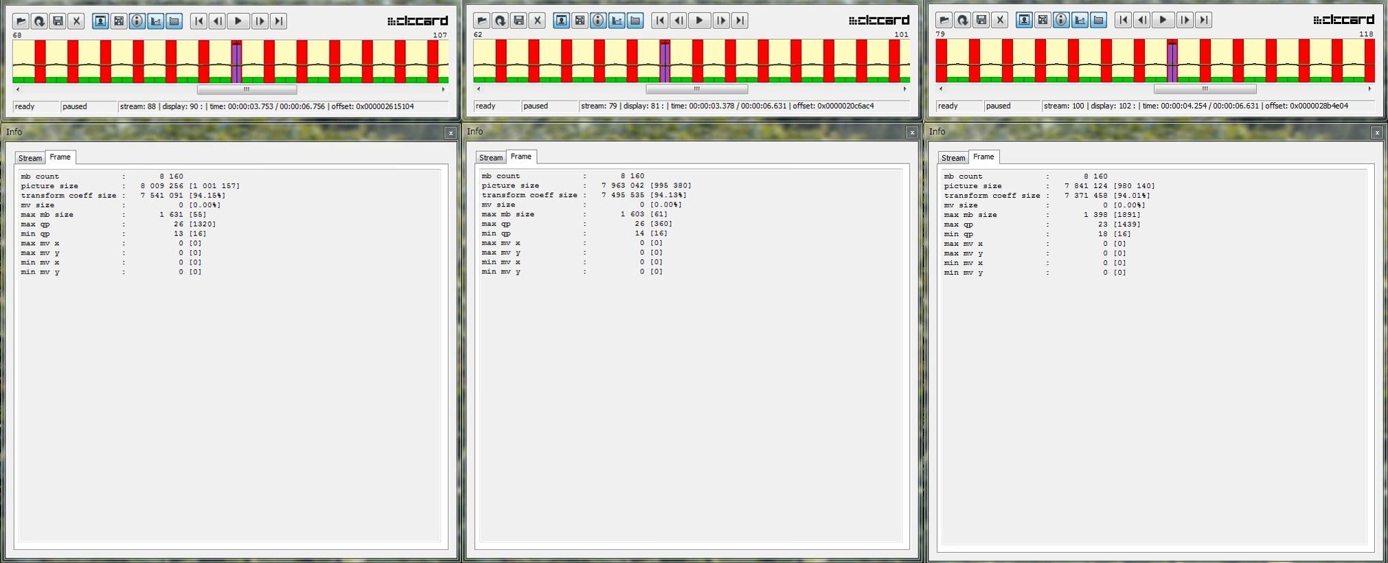 5D2の方はIフレームの中の全てのマクロブロックのqpが同じ値になっているのが特徴です。流石5D2、昼も夜も結構頑張ってますね。このサンプル動画の全てのIフレームのqpがそれぞれ21と18であるわけではなくて、ここでは一番低いqpになっているIフレームを選びました。 GOP3ZILLAはというとqpが13~17、GOLGOP3-13は11~15となっています。 ちなみにここには挙げませんが、megaMAQ2は更に9~13位になるでしょう。 qpが低い方が圧縮率が低い=高画質とすると、GOLGOP3-13は夜はかなり高画質なのがわかりますね。 ましてや3GOPですからIフレームの密度もご覧の通りなわけで・・・ これだけ見れば文句なしにGOLGOP3-13が一番!なのですが、先日から貴兄に茶畑サンプルを沢山撮っていただいた結果を見ると、高精細なシーンではこれが逆転してしまいます。 そう考えると・・・5D2が茶畑でどこまで頑張るのか?ちょっと興味があるところですね^^