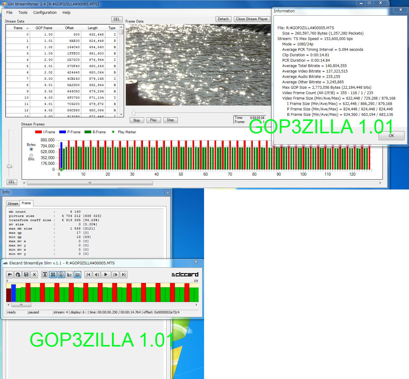 StreamParserでは、GOP3ZILLA MAXのIフレームのサイズが約1.16MBとなっていました。 このあたりがIフレームの限界近くなんでしょうね。カメラ内再生はできませんでした。 ただ、文字通り(数字通り)最高画質だと感じました。 対してGOP3ZILLA改良版v1.01はIフレームのサイズこそ若干MAXに劣りますが、カメラ内再生 問題なく出来ました。 利便性を考えればGOP3ZILLA改良版v1.01の方が実用的かもしれませんね。