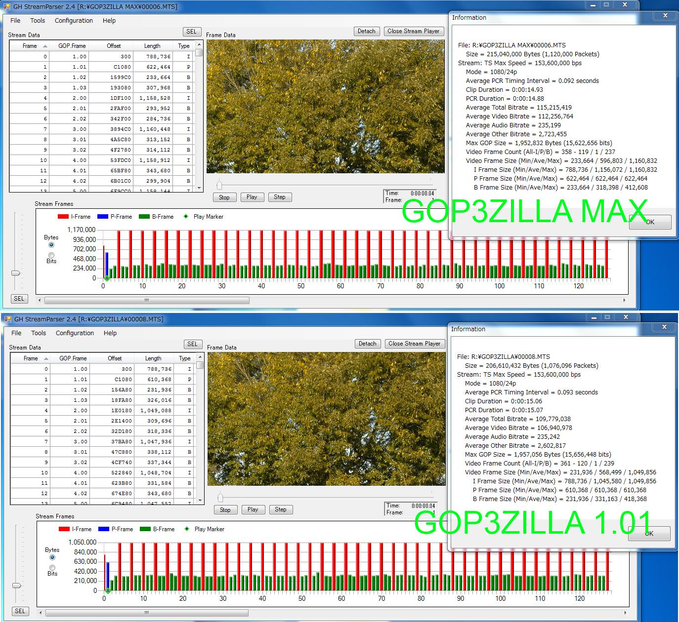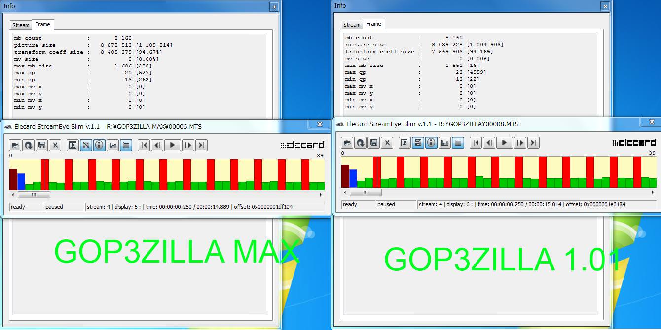(画像1枚目StreamParser:上がGOP3ZILLA MAX、下がGOP3ZILLA改良版v1.01) (画像2枚目StreamEye:左がGOP3ZILLA MAX、右がGOP3ZILLA改良版v1.01)