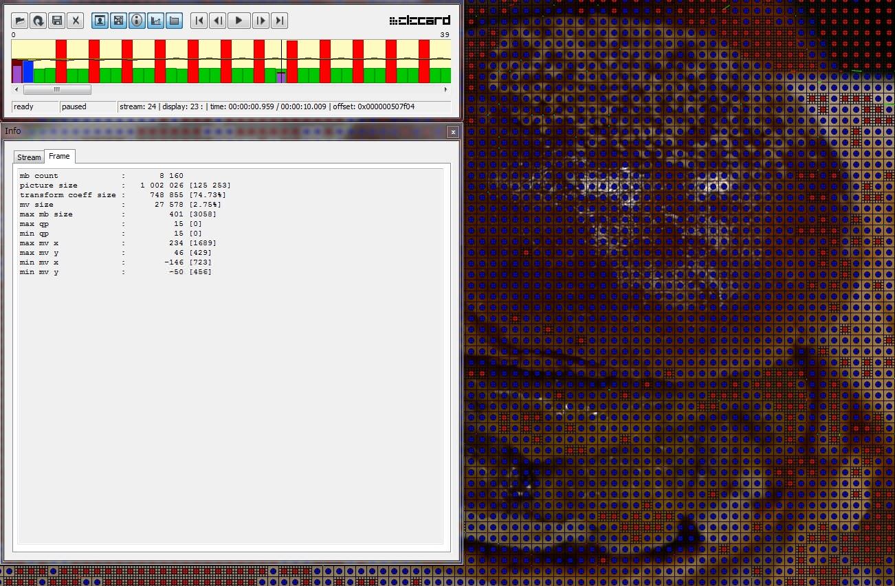Bフレームを見てみても、ここはゴマやテカり部分だけでなくバンズ全体が16x16のBフレーム用マクロブロック?(青い部分)を使っていて、少なくとも浮いて動いているように見えるところだけ別扱いされている感じはしないのです。
