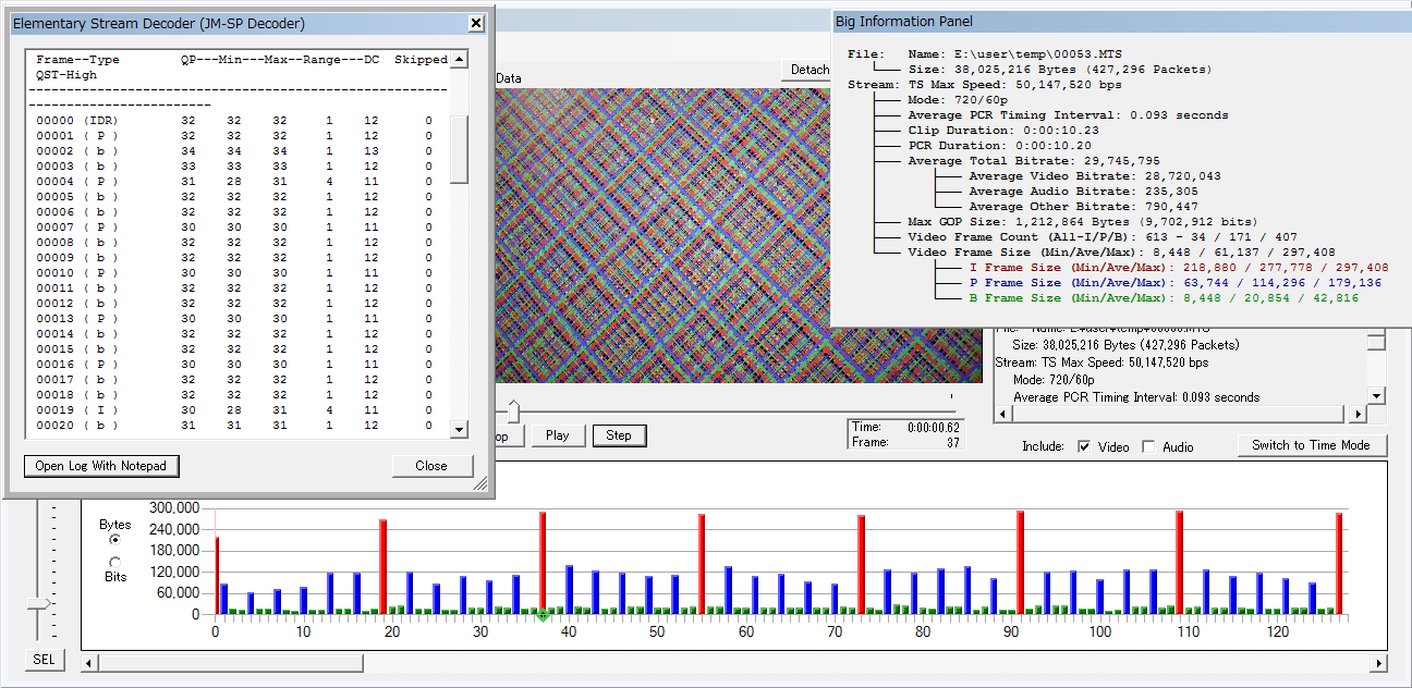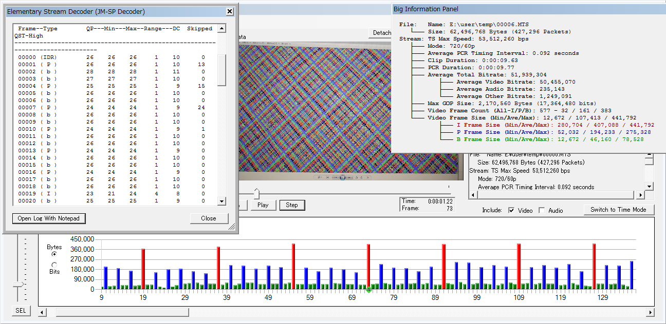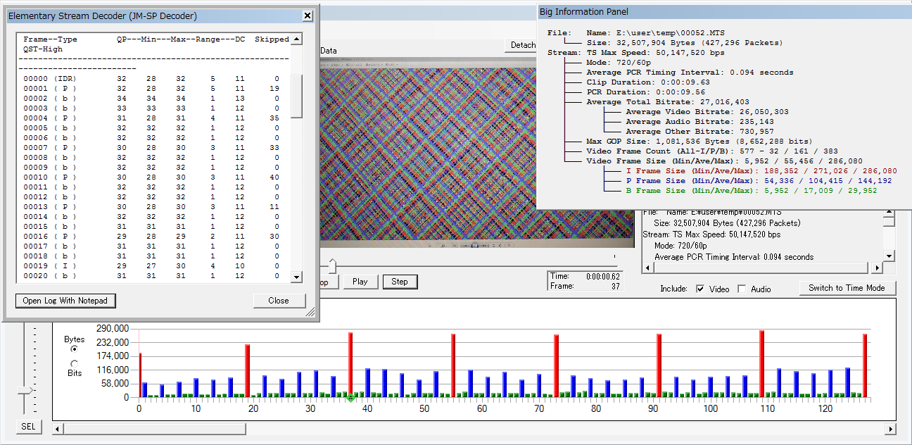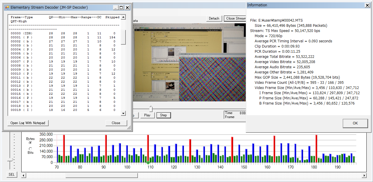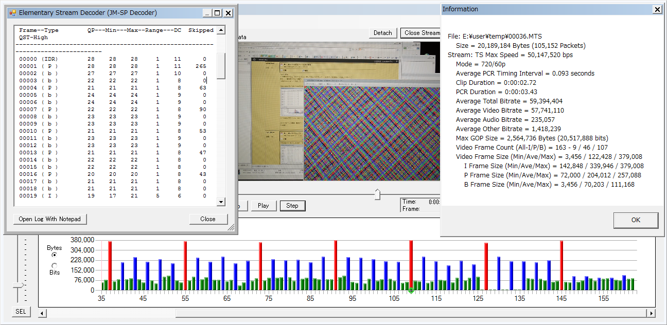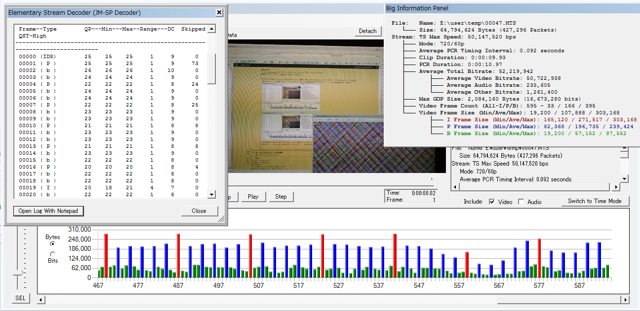 お手本の Quantum X(V3)の 720pですが、ストレス耐性に関しては余り詰めてないようで デスチャートでは落ちます。が、落ち方が独特で「3-5秒でエラー停止するが、フリーズしない」ので、停止までの.MTSデータは残ります。細かいセッティングは違うものの、σ(^^;のアレンジも そこの挙動は同じです。なので、チャートの表示面積を徐々に減らしていくと、、、 上は3秒ほどで止まったサンプルですが、エラー直前にドロップと P-frameの萎縮?が続発しちょります。下の継続撮影できてる条件でも、後半は P-frameが萎縮しており一杯一杯な ふいんき(ry なのかも。 ※肝心のフレームサイズは、現状では↑このレベルで、、、伸ばせるかどうかが肝ですかね
