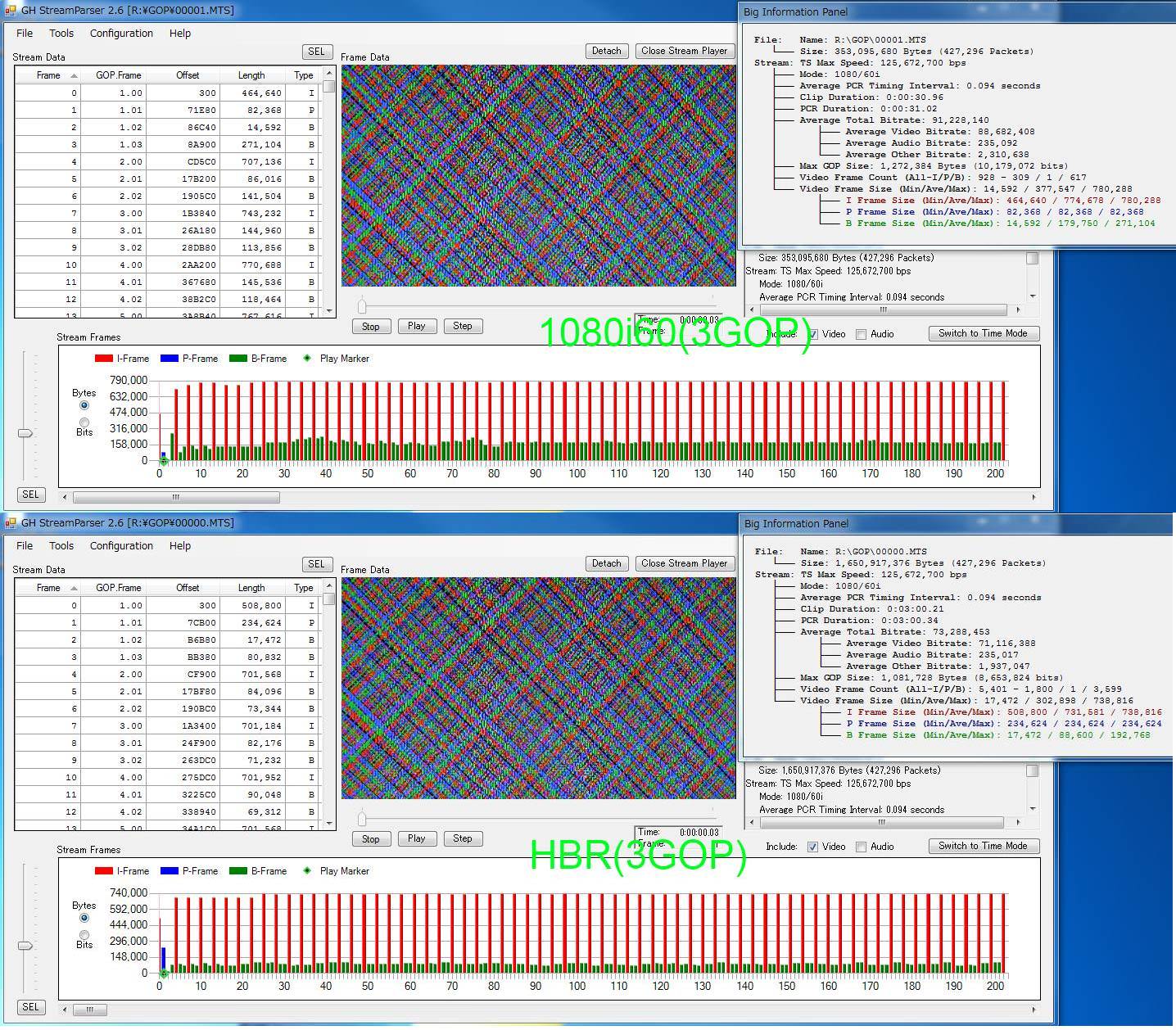 という雰囲気になっています。(まだほんの少しの数字しか弄っていませんが) 普通ならGOP Tableの数字を小さくしてみたいところですが、今回の3GOPはその逆を行きました。 LowGOPで1080i60が1080p24に比べて耐性が低そうなのはbkmcwdさん他本家の方の書き込みを見て感じて いましたので、じゃあGOP Tableでその耐性を「緩和」できるんじゃないかと。 (↑「緩和」的な考えは完全に自分勝手な考えなので^^;)、棒読みしてください)