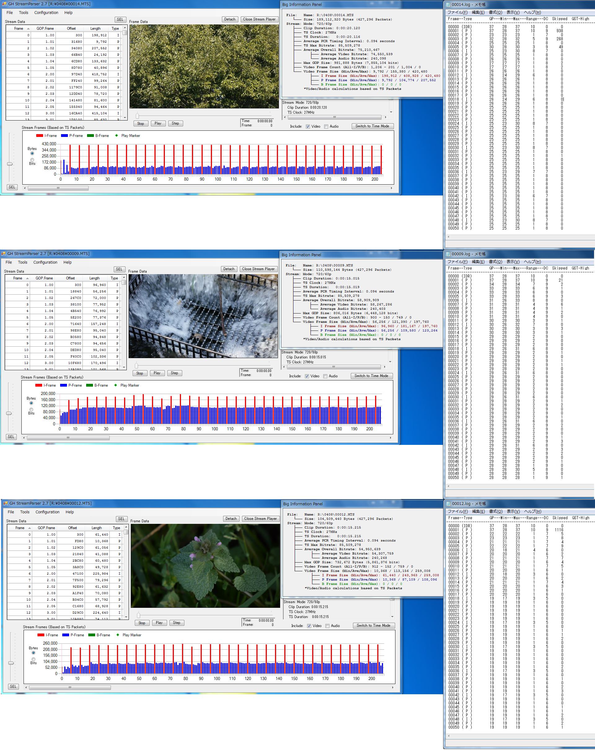 ※上から、『木』『排水溝』『草(露出アンダーぎみ)』 でいずれも720p60(SH)
