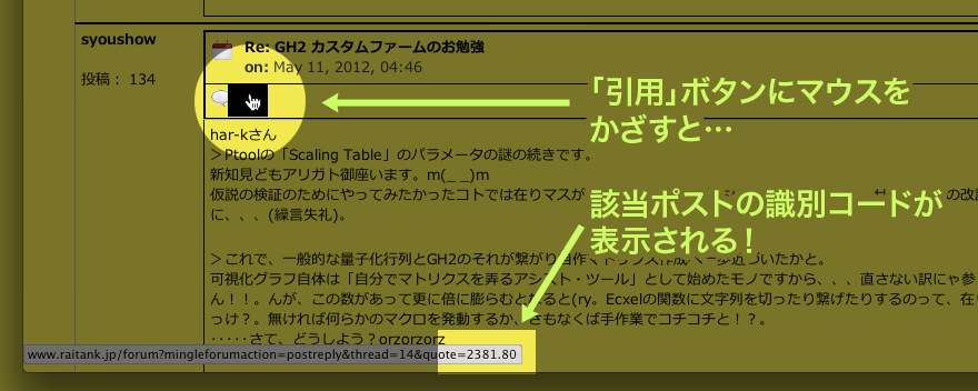 ➡ 特定ポスト識別コードは、該当ポストの「引用」ボタンにマウスオーバーした時に、ブラウザのステータスバーに表示されるリンク末尾の「○○○○.●●」という数字です。
