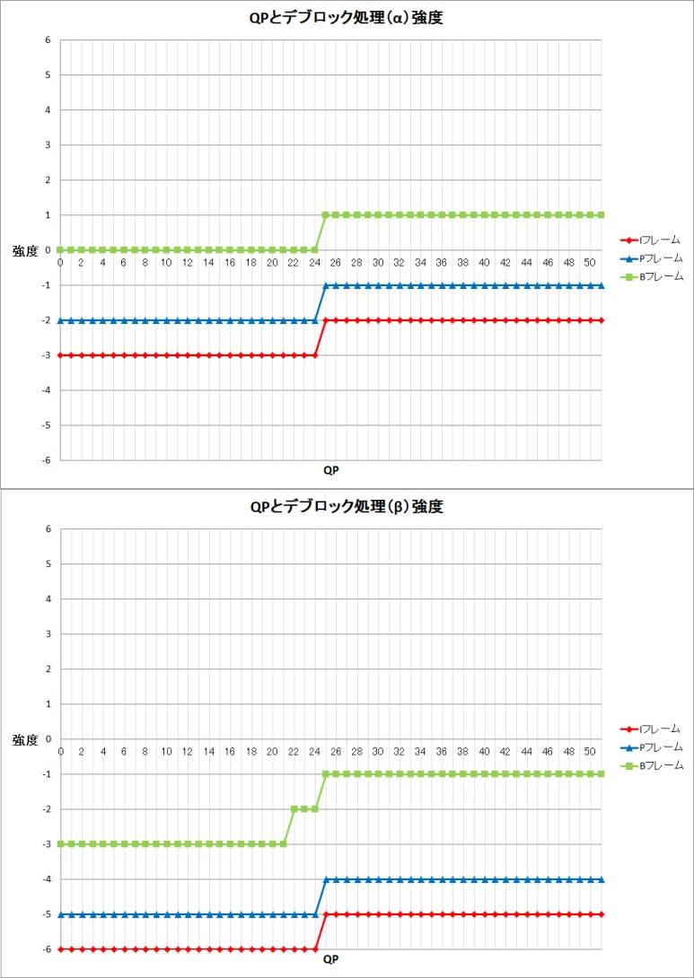 GH2の"Debloking tables"の「Table Flag1」だけですが、デフォルト値のQPとデブロック処理に 関連する"α"と"β"をグラフに纏めてみますた。 ※参考(以下、http://www.j-tokkyo.com/2008/H04N/JP2008-022404.shtml より一部抜粋) "α" → "slice_alpha_c0_offset_div2":6~+6 の13段階 - スライスを4×4画素のブロックに分割した場合のブロック境界に適用されるデブロッキング処理 の強度を調整するためのパラメータ ~(中略)~ 値が小さくなるほど、適用されるデブロッキング処理 の強度は弱くなり、値が大きくなるほど、適用されるデブロッキング処理の強度は強くなる。 "β" → "slice_beta_offset_div2":6~+6 の13段階 - スライスを4×4画素のブロックに分割した場合のブロックの内部の画素に適用されるデブロッキング処理 の強度を調整するためのパラメータ ~(中略)~ 値が小さくなるほど、適用されるデブロッキング処理 の強度は弱くなり、値が大きくなるほど、適用されるデブロッキング処理の強度は強くなる。 (画像1 QPとデブロック処理強度の関連グラフ ※ 上が"α"、下が"β"についてI,P及びBフレーム いずれもGH2の「Table Flag1」のデフォルト値 ) デフォルトでは全体的にややマイナス(強度弱)の方向のようです。 QP25~付近でやや強度強方向に変更するようですね。 画質劣化(QP高)によるブロックノイズ発生を緩和する、という理論なんだろうか? フレームの種類での違いもありますね~。 確かに、インターほど画質劣化は起き易いような気がするので そういうことなのか? ただ、ハイビットレートが可能なハックではまた事情が違ってくるカモ。