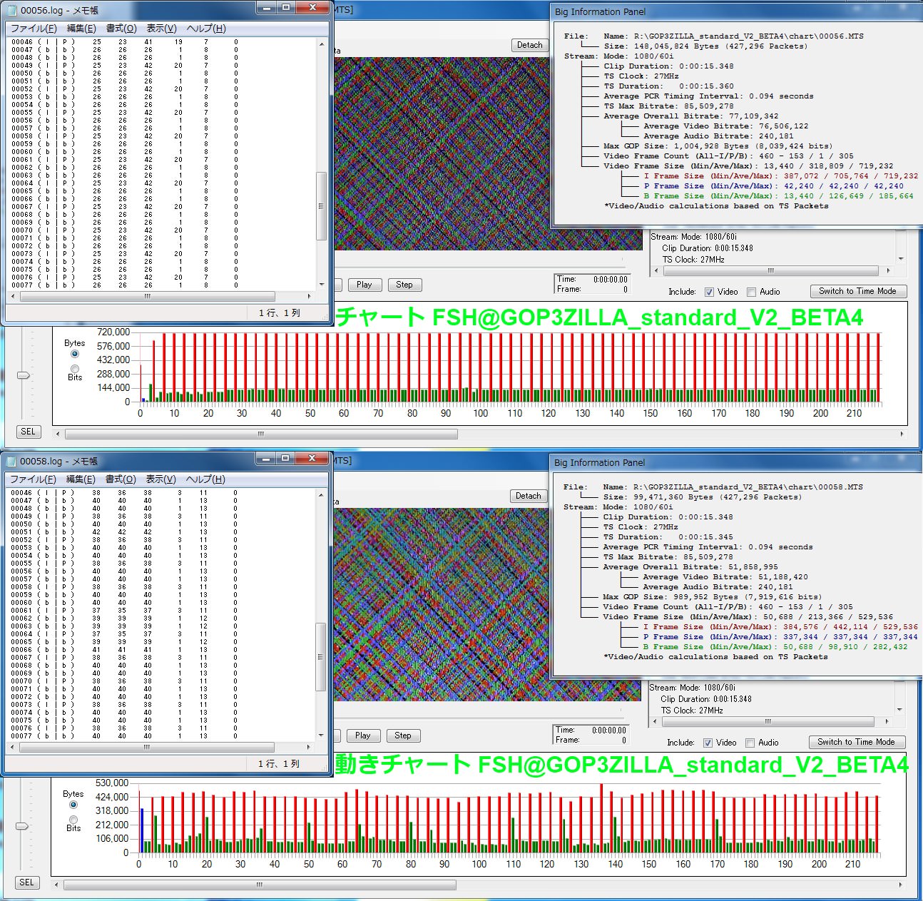 みなさん、こんにちは bkmcwdさん >GOP3ZILLA-MAX_Standard_V2_BETA1&2 サンプルみました! FSHとHBRもMAX仕様な感じでイイですね。 ところでVimeoのHBR30pは、実は1080i60だったりしません? 生データ落としたらヌルヌルな60fpsのステディカム映像で、自分はこのヌルヌル感も十分スキですが^^;) >ちなみにPC不調の原因はグラボのドライバーが原因のようでしたが、 最近のコノ暑さもアレですかね? うちのPCも冷却ファンがうるさく唸り出しました^^;) ところでハックしたGH2は夏でもダイジョウブですか~? GH2は他のカメラより暑さにも強そうですけど、 ワタクシは夏はまだ経験してないので。。。 syoushowさん オモシロそうな実験ですね~。 例の「?」ですが、 >1)1st GOPのパターンが変?(指定していない Pが入る) これはStreamEyeやら例の解析ソフトでもPフレームが入っているのが見えるので、GH2の仕様のようですね~。 まぁ、最初の数フレームは音声もほぼ無音状態のようですし捨てフレームってことで^^;)
