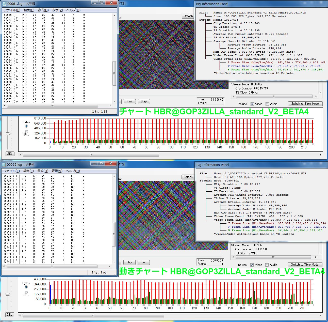 今回公開したGOP3ZILLA-MAX_Standard_V2_BETA1&2は、BETA1がストックのまま、BETA2には実験的Deblocking_Tablesを組み合わせています。 私がサンプルで上げたのはBETA2の方で、24pとHBR30pとなっています。 フレームリミットは元々24pがストック×1.16になっていたので、全てのモードでこれに合わせています。FB周りも全部1.16倍で統一しました。 ちなみに何故1.16倍かというと、24pではこれより上げてもこれ以上フレームサイズが大きくならないこと、そして、フレームリミットが高過ぎるとspanしにくくなってしまうことがわかっているからです。 24p以外でのこのような事情はまた違うと思いますが、今回は真面目にすべてをストックの1.16倍に揃えてみました。