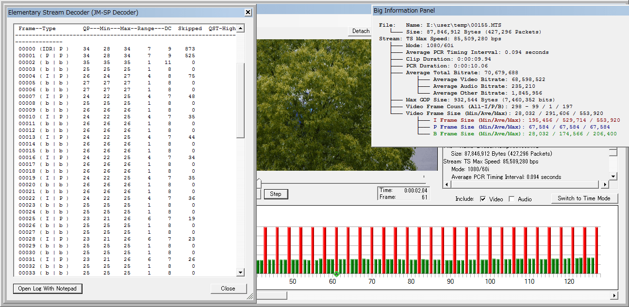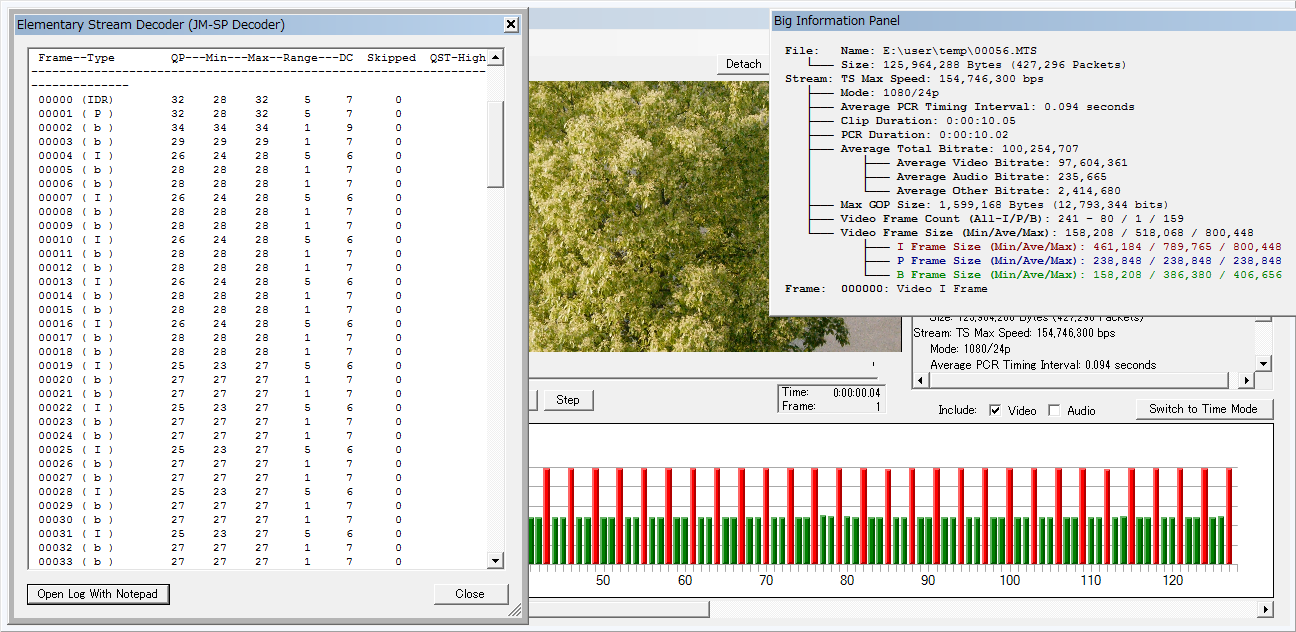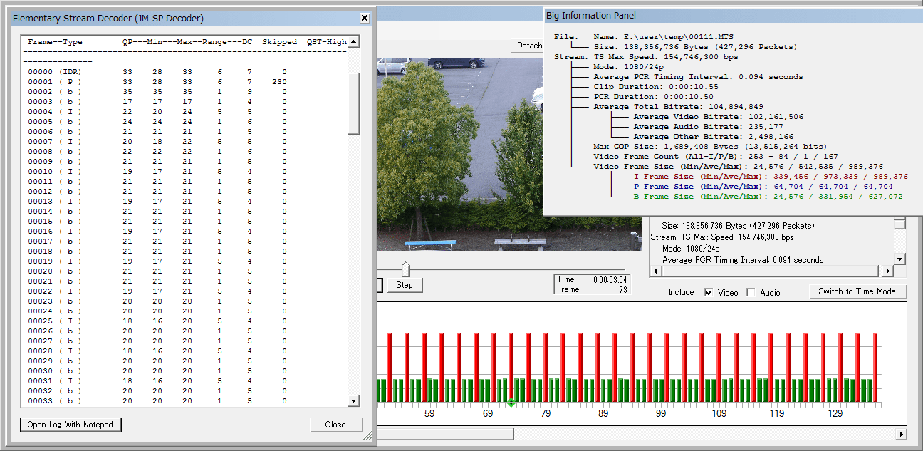 最近のパターンで4条件撮ってビットレート最大/最小のを並べてますが、今回は何故か最小が iso800+ETCになってます。微風とはいえ暗かった(ssが遅すぎた)のが原因か?、上のも I-frameが1M切ってる大人しいデータですねぇ(Maxらしくない??)。
