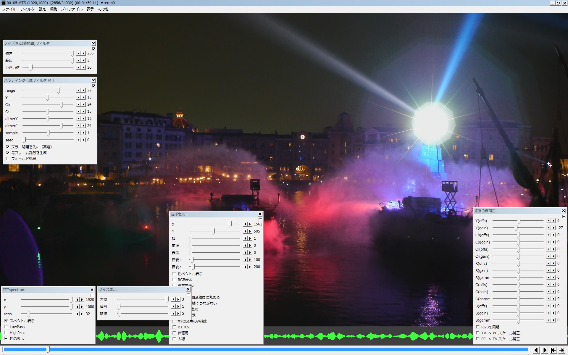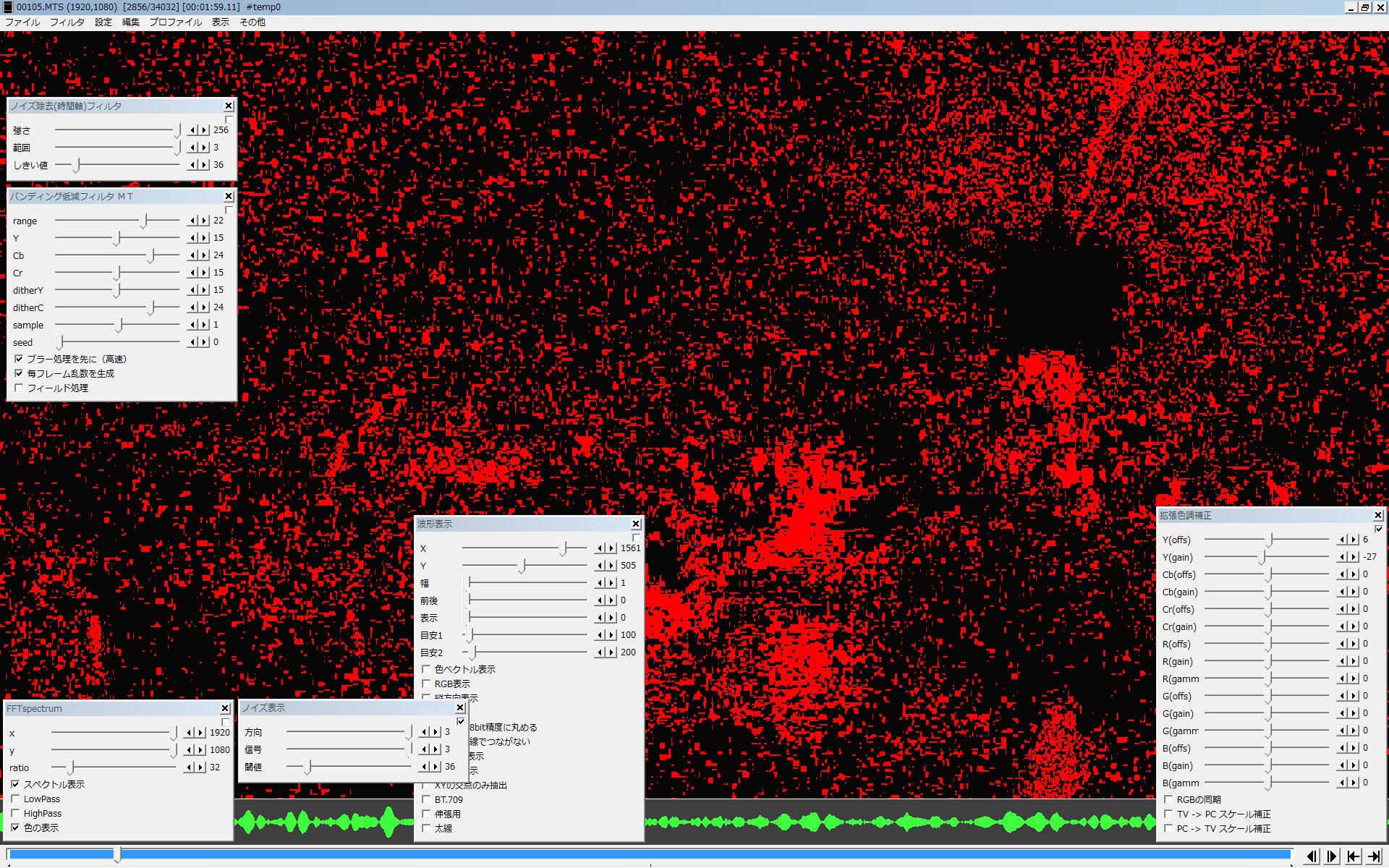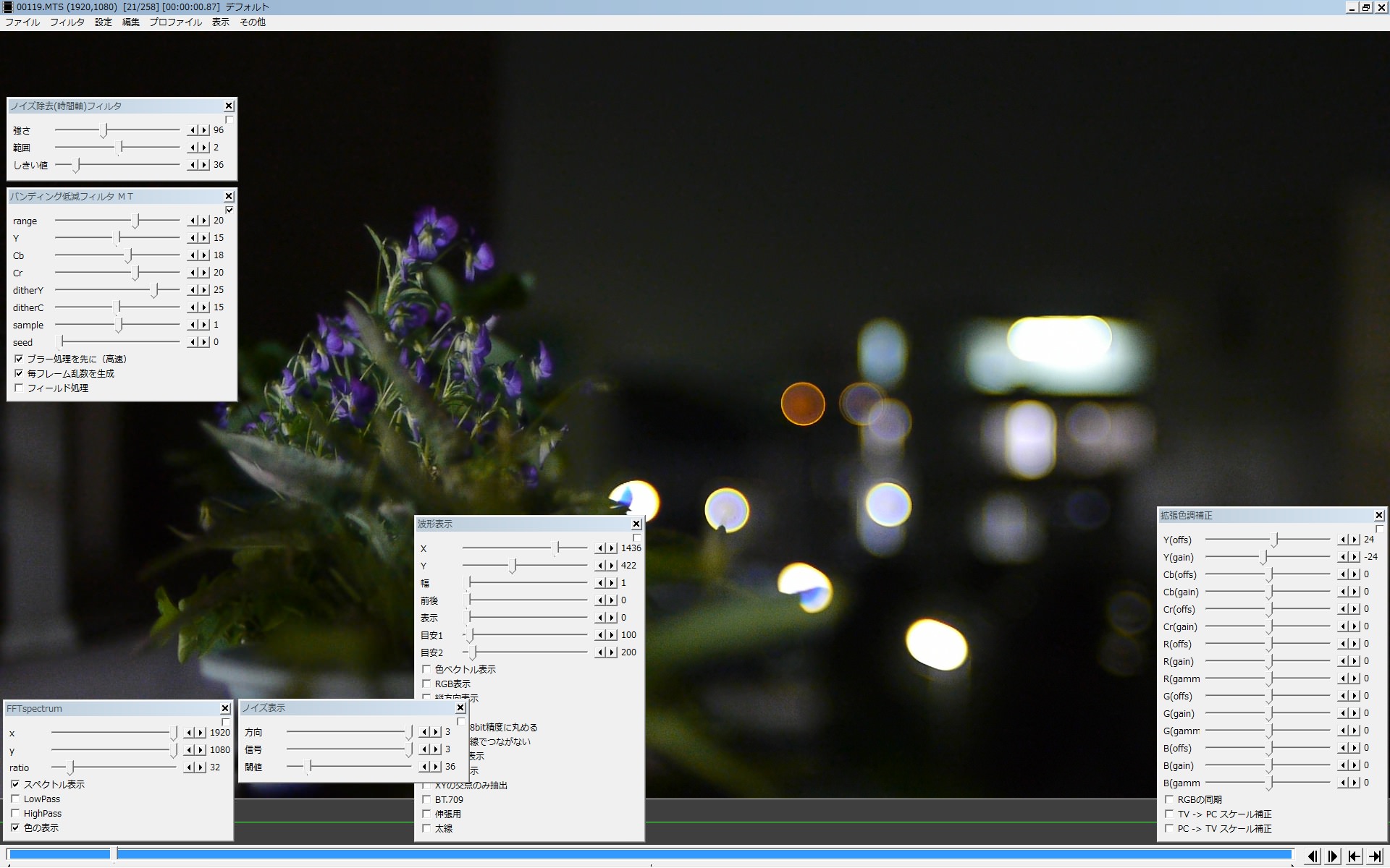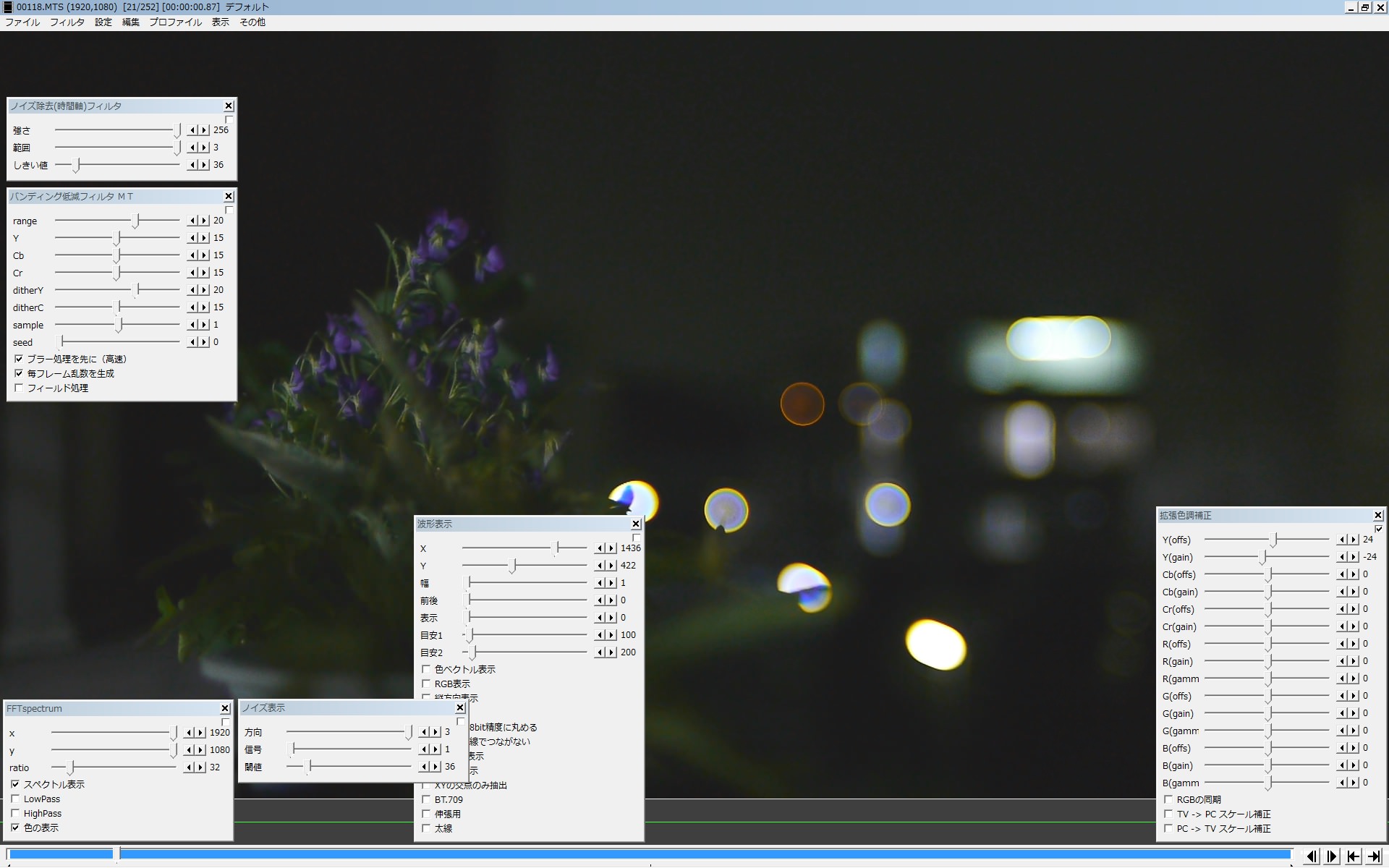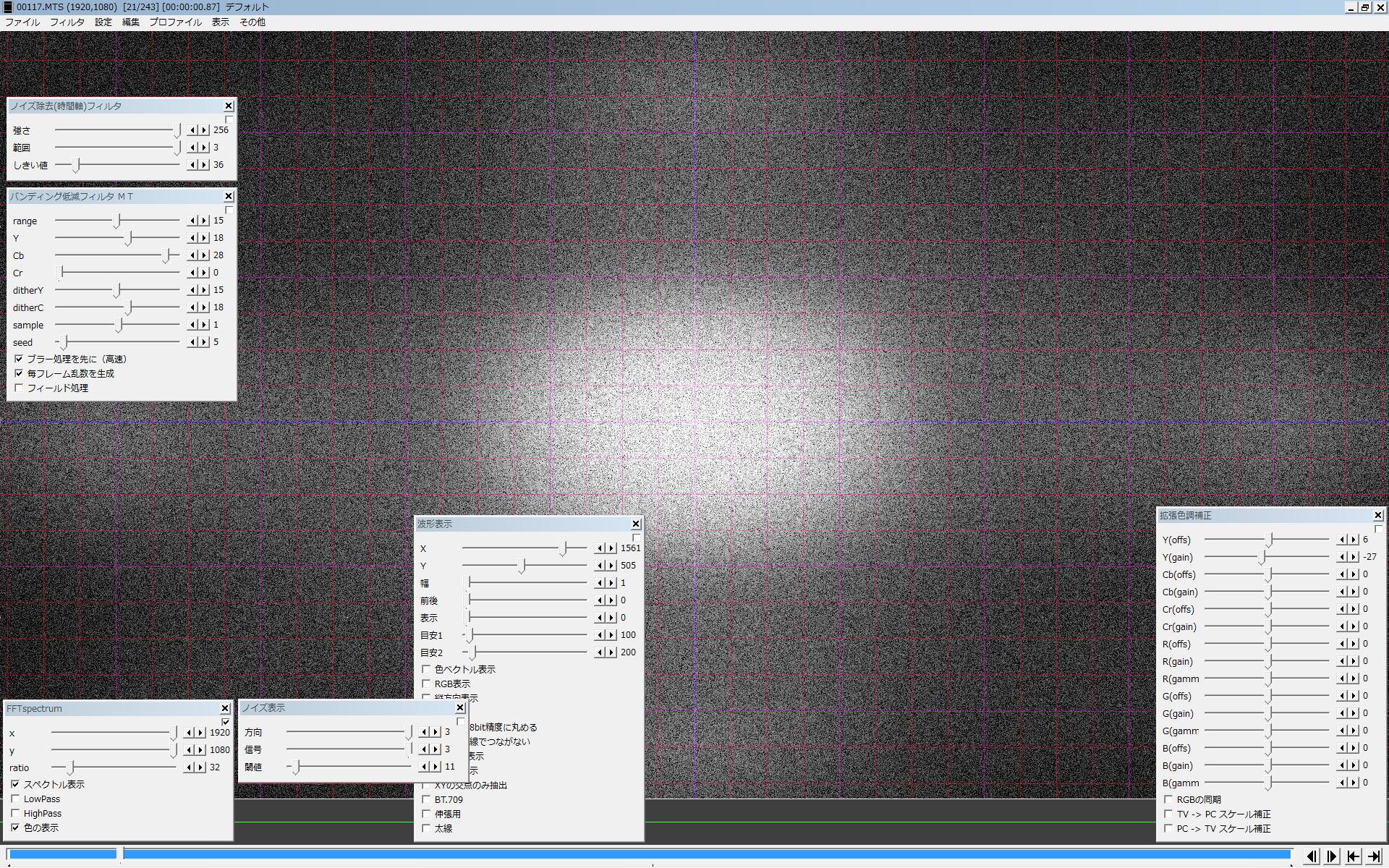 処理の内容としては、 1)強く効くNR(今回は内蔵の 3D-NR)使って、ターゲットのノイズを緩和して 2)取り切れずに残るムラを、バンディング低減フィルタMTで ボカしてます