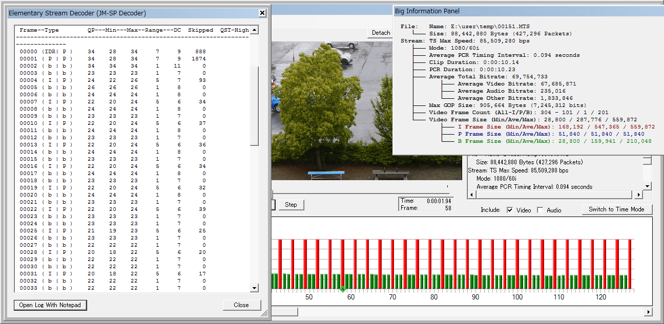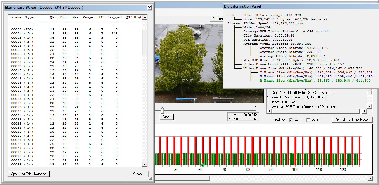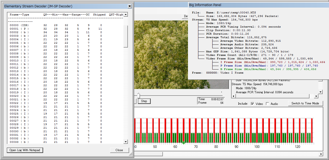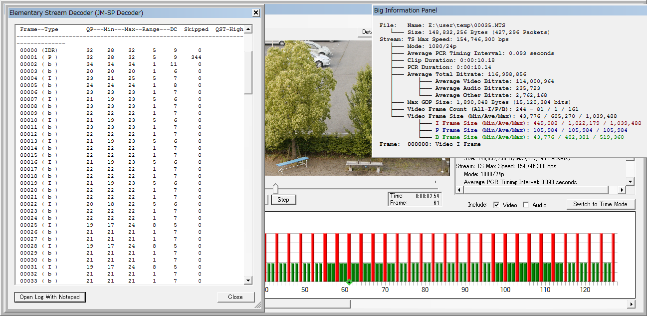 もっとストレスフルな映像だと Sednaとの差が目立たなくなって、ストックの Lowlightの結果が異彩を放ちます。今朝のと同じく上から Lowlight、Sedna、Sedna改ですが、I-frameが伸びてるのはストックの Lowlightだけ。Sedna改は Sednaと大差ない ふいんき(ry で、ちょっとだけビットレートが伸びてる程度ですね。