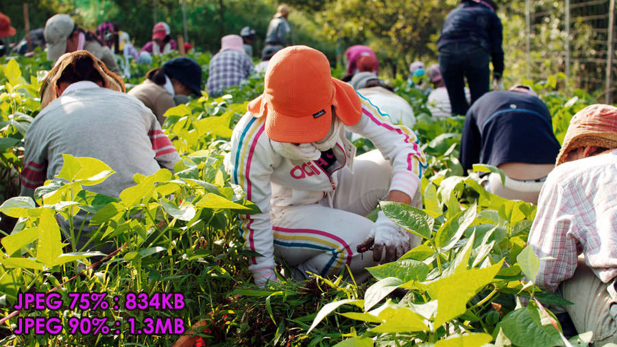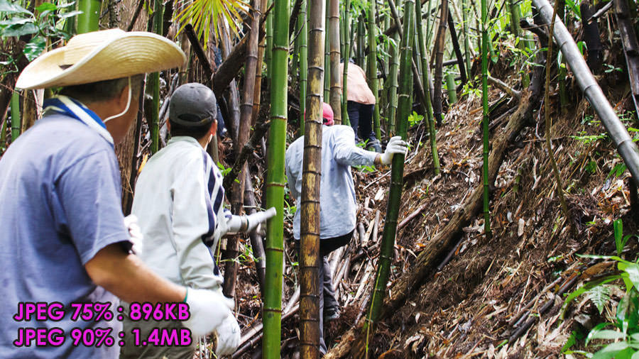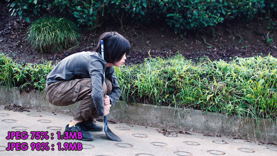 そこで、ここではデジ一で撮影した写真のコマから1080p画角に切り出したのち、さらに DxO社のフィルムルック化ソフトで、少々グレイン(=ノイズ)を足した画像を3枚用意し、それぞれを JPEG75%と JPEG90%で保存した場合の容量を記してみました。