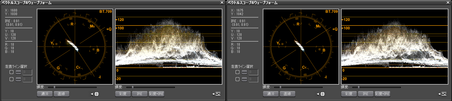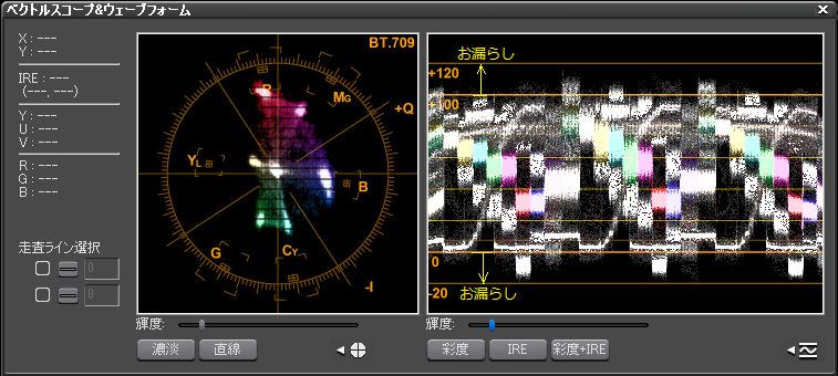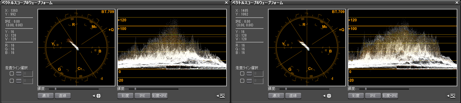 >>バイブラント(+2+2+2+2) でも 0 ~100 IREに収まっていました。 >>漏れなしです。 >お漏らししない映像条件だったものか?