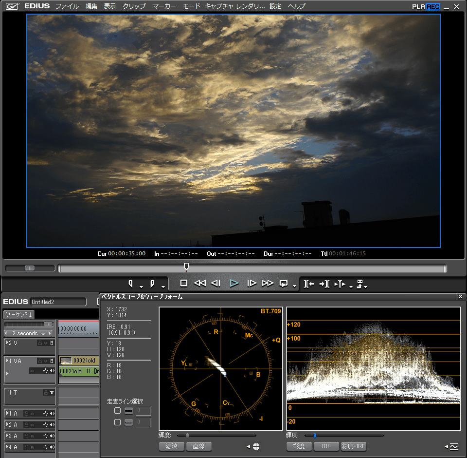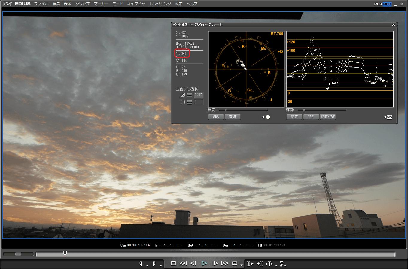 Ediusのウェーブフォームの詳しい情報が無く、先ずは使い方が不適切だったょうです(滝汗;。表示設定を変えて、上はノスタルジックで白飛び警告がギリギリ出たもの、下はバイブラントでさらに+1/3EV露出としたもの。
