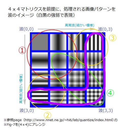 ① DCT(絵を低周波数成分~高周波数成分に分離する) ※その後の圧縮をし易いように