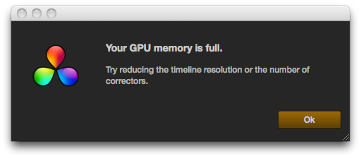 「Your GPU memory is full. Try reducing the timeline resolution or the number of correctors.」