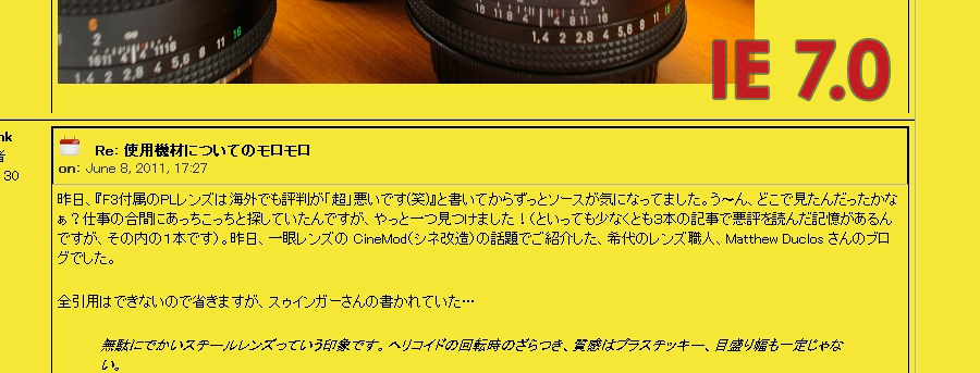 昨日、『F3付属のPLレンズは海外でも評判が「超」悪いです(笑)』と書いてからずっとソースが気になってました。う〜ん、どこで見たんだったかなぁ?仕事の合間にあっちこっちと探していたんですが、やっと一つ見つけました!(といっても少なくとも3本の記事で悪評を読んだ記憶があるんですが、その内の1本です)。昨日、一眼レンズの CineMod(シネ改造)の話題でご紹介した、希代のレンズ職人、Matthew Duclos さんのブログでした。