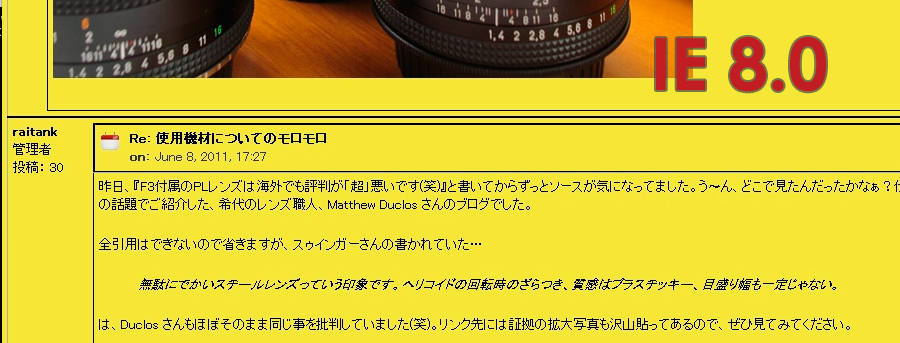 すると!驚愕の事実が判明しました! Winの IE だからというワケでは決してなく、ほとんどのバージョンで問題なく表示されているのに、ただ一つ!「IE8.0」だけにこの問題が起こっていたのでした!(添付画像参照)